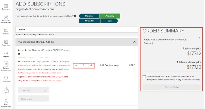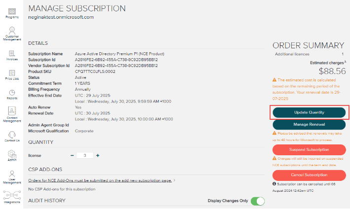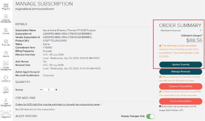 On the right-hand side of the screen, an Order Summary will appear with the estimated value of the quantity change invoice. Please note that the quantity change invoice will be a pro-rata invoice from the date of the quantity increase request until the end of the subscription term.