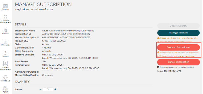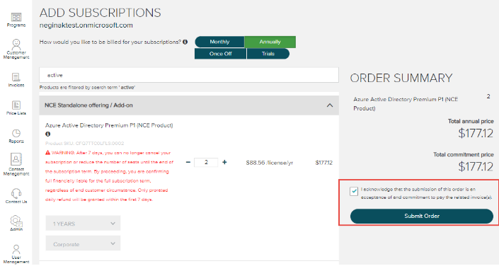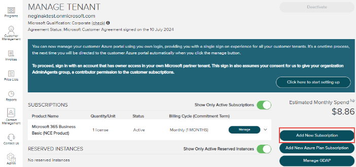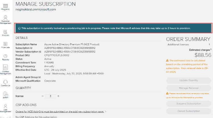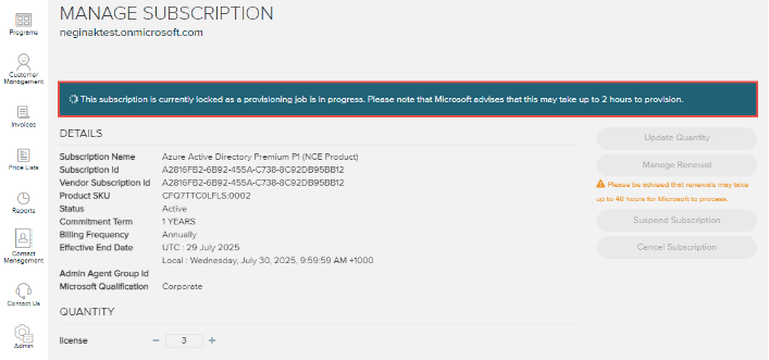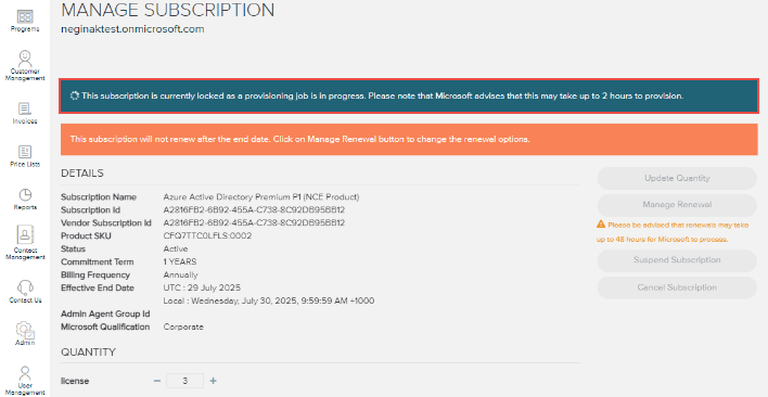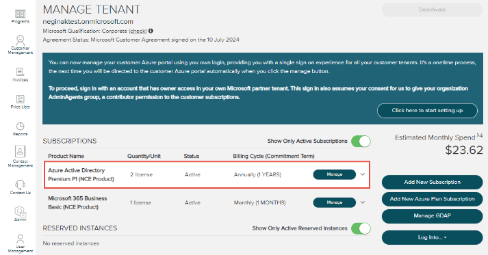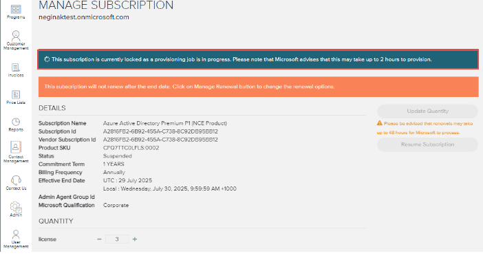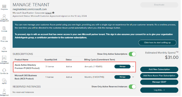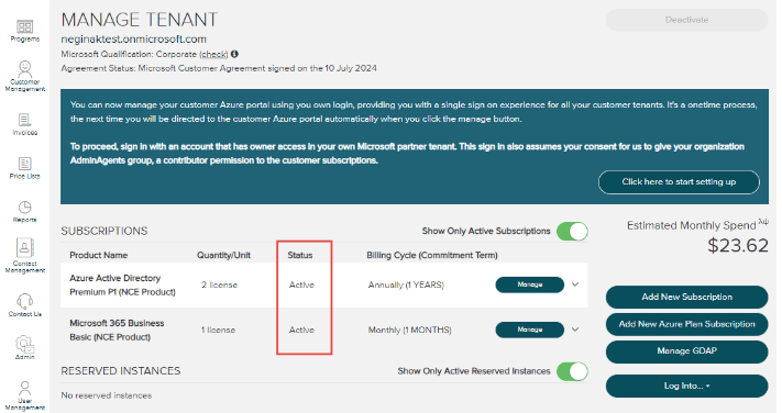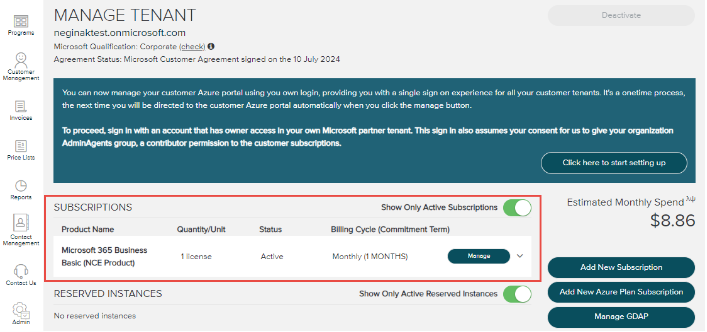 Once the invoice is paid, your subscription will move to a provisioning state with Microsoft, and once the provisioning is completed, you will be able to see the subscription listed as “Active” under the Manage Subscription page, and “active” under the Manage Tenant page.