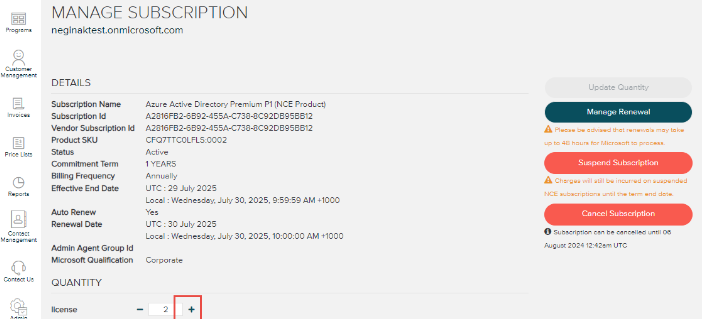 To increase the quantity, navigate to the tenant and select Manage next to the subscription requiring a quantity increase.