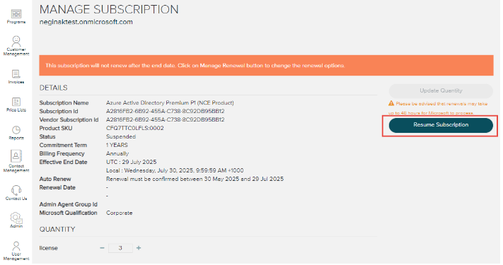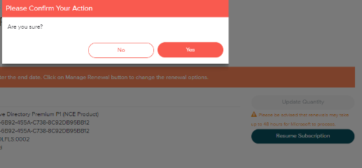 Under the Manage Subscription page, select the “Resume Subscription” button.