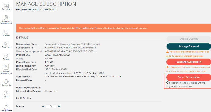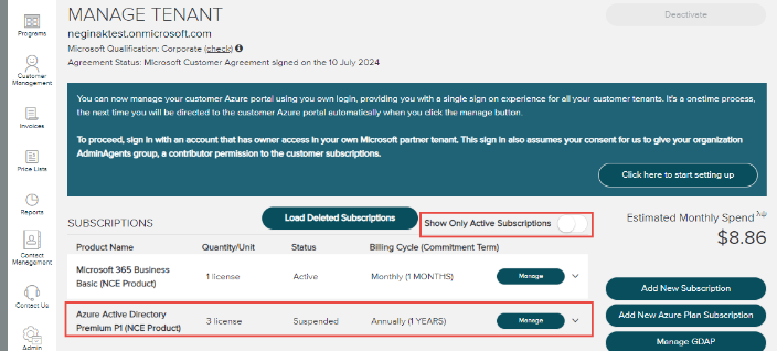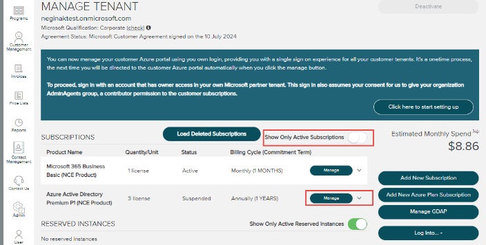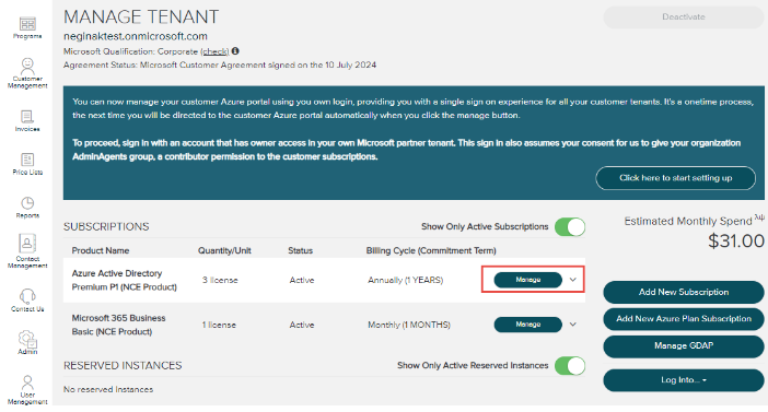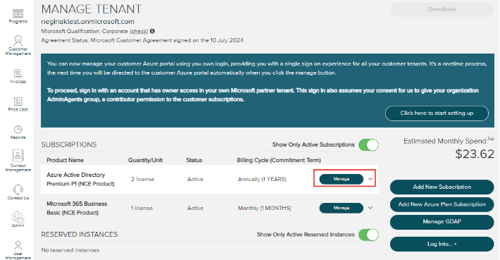 To cancel a subscription, navigate to the tenant and select Manage next to the subscription requiring cancellation.