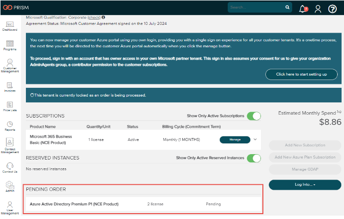 The order will then be visible under the “Pending Order” heading on the Manage Tenant screen.