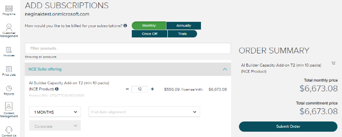 Update the number on the screen to match the quantity you would like to order. This action will update the Order Summary on the right-hand side to show the total monthly value of this order.