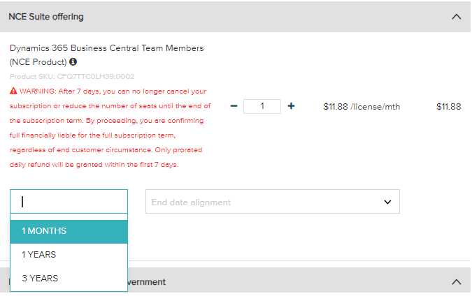 Choosing Term "1 Months" = subscription will have a 1-month commitment and billing term i.e. If provisioned on the 14th of March 2022, the subscription term is 30 days, so the next renewal date is the 13th of April 2022, you will receive a monthly bill for this subscription.