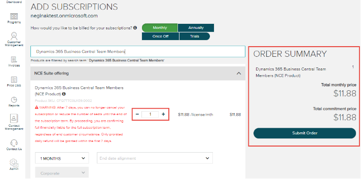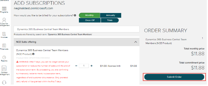 Note: Decreasing subscription quantity is not possible after the first 7-days. If an order is submitted through PRISM post 7-days cancellation window, it would get rejected from Microsoft Partner Centre, and the following notification would be presented on the order failure.