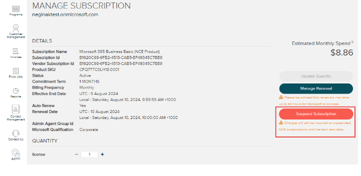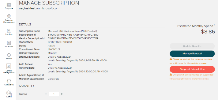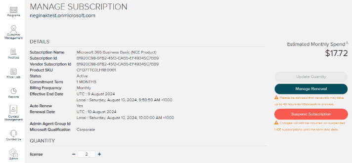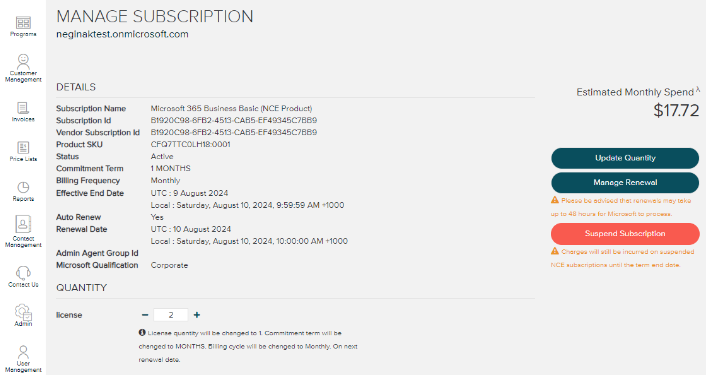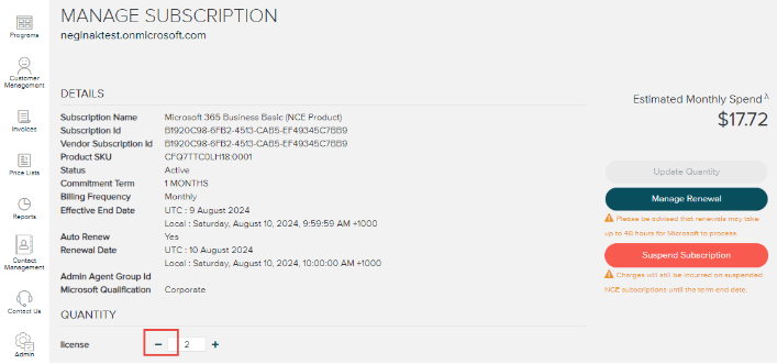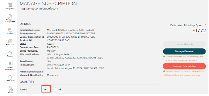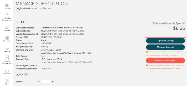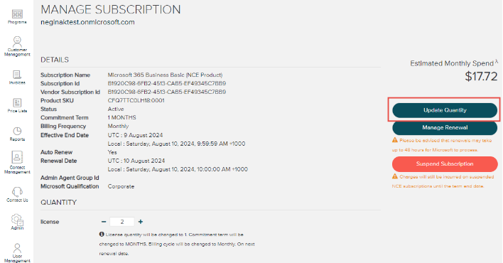 On the right-hand side of the screen, an Order Summary will appear with the estimated monthly value of the subscription and will enable the Update Quantity button. Please note that on your monthly invoice, the quantity change will be invoiced as a pro-rata line item from the date of the quantity decrease request until the end monthly term.