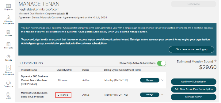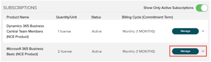 To increase the quantity, navigate to the tenant and select Manage next to the subscription requiring a quantity increase.