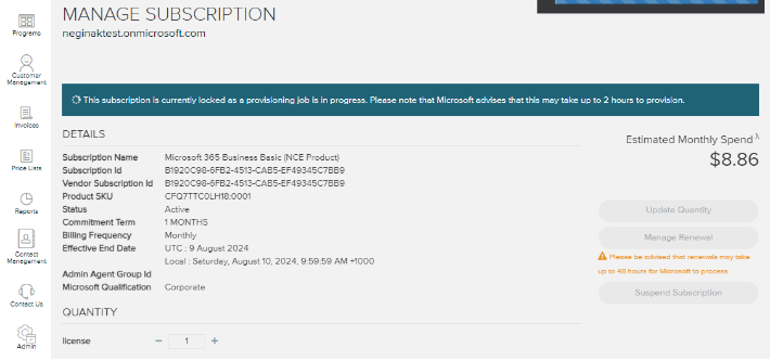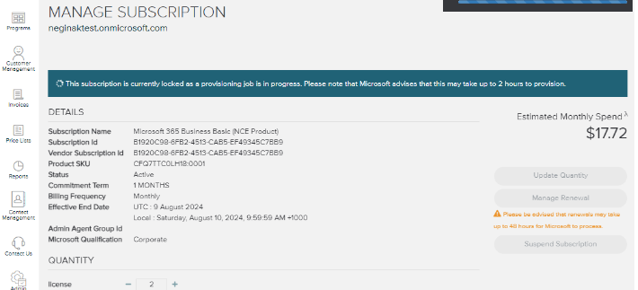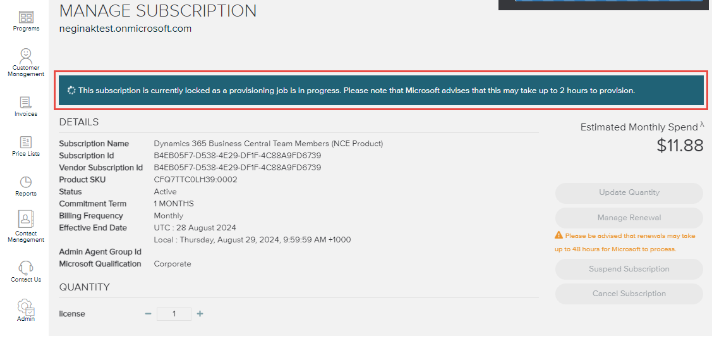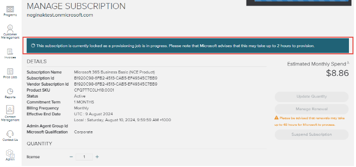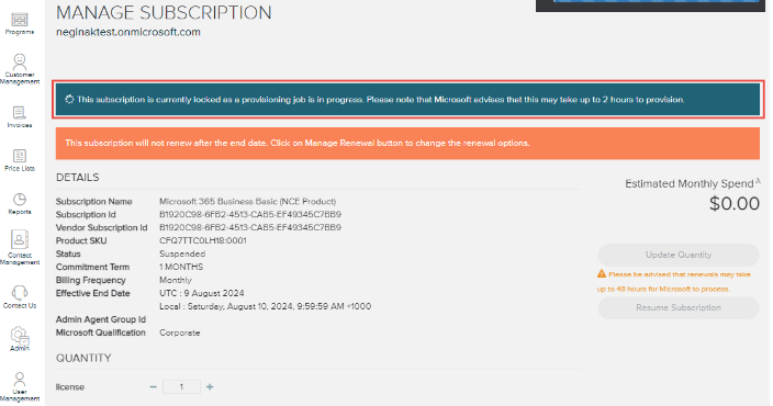 Once completed, the job notification will be removed from the Manage Subscription page, and the quantity will be adjusted on the Manage Tenant screen.