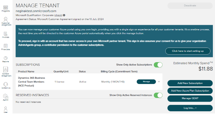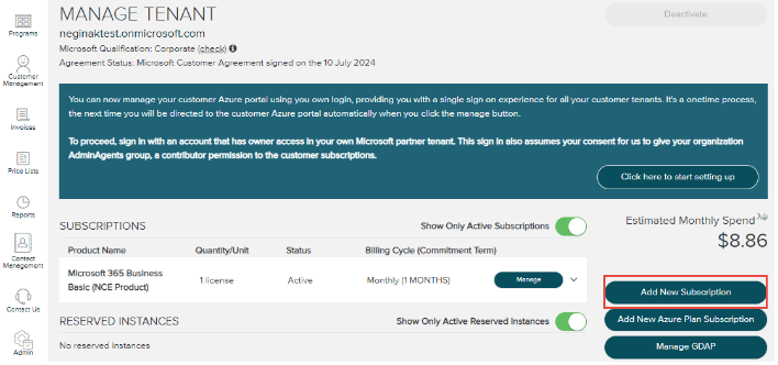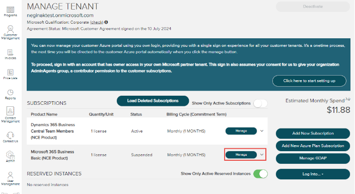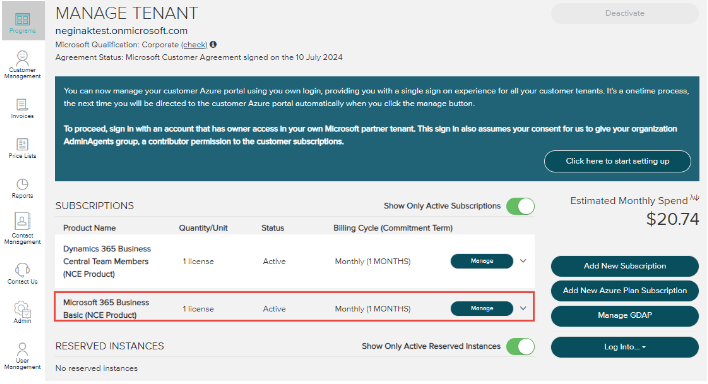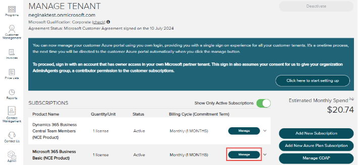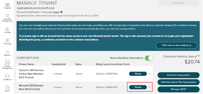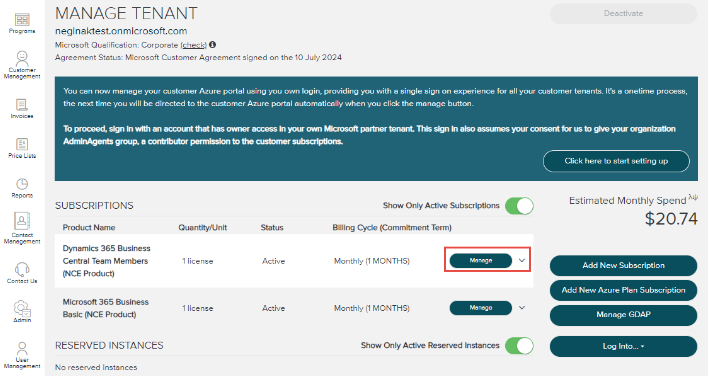 To cancel a subscription, navigate to the tenant and select Manage next to the subscription requiring cancellation.