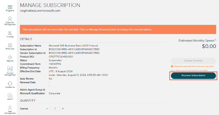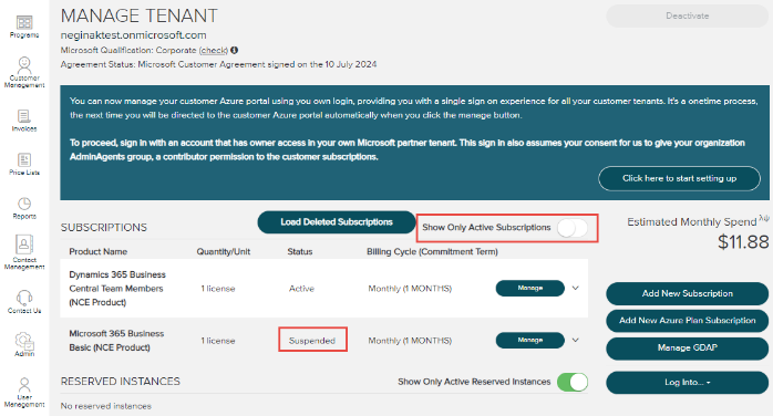 To resume a previously suspended subscription, navigate to the tenant, and turn the “Show Only Active Subscriptions” toggle off to see all suspended subscriptions.