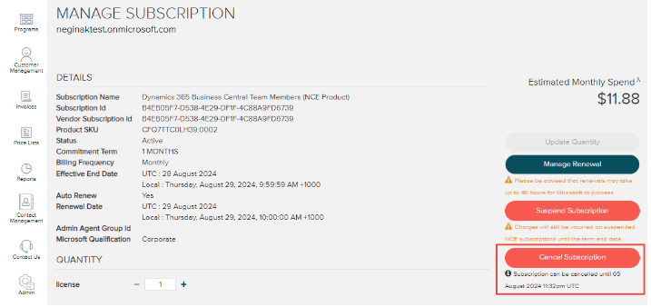 Note: Once a subscription is provisioned and active, the subscription billing would have started. If cancellation occurs within the 7-day cancellation window, there would be pro-rata charges applied for the subscription until cancellation. All subscriptions after the 7-day cancellation window will be invoiced and charged for the duration of the contractual term, including any quantity increases.