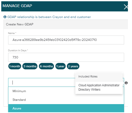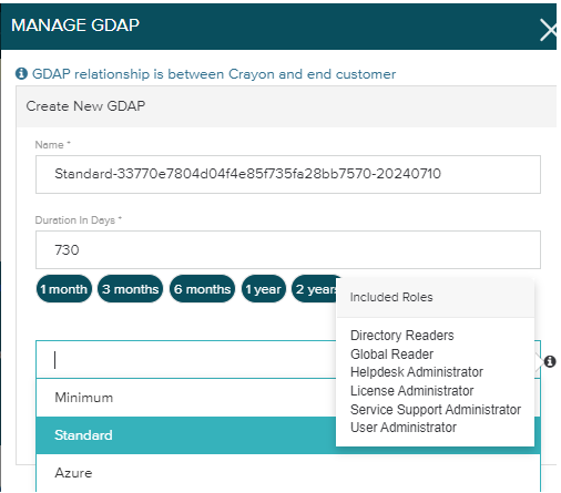 Within the Manage GDAP popup pane, there is an option to set the duration ( upto 2 years ) for the GDAP permission preset.