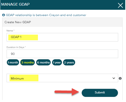Within the popup pane, enter the relationships name followed by the duration in days ( or choose the most commonly used options below). Select the permissions level required and the click submit