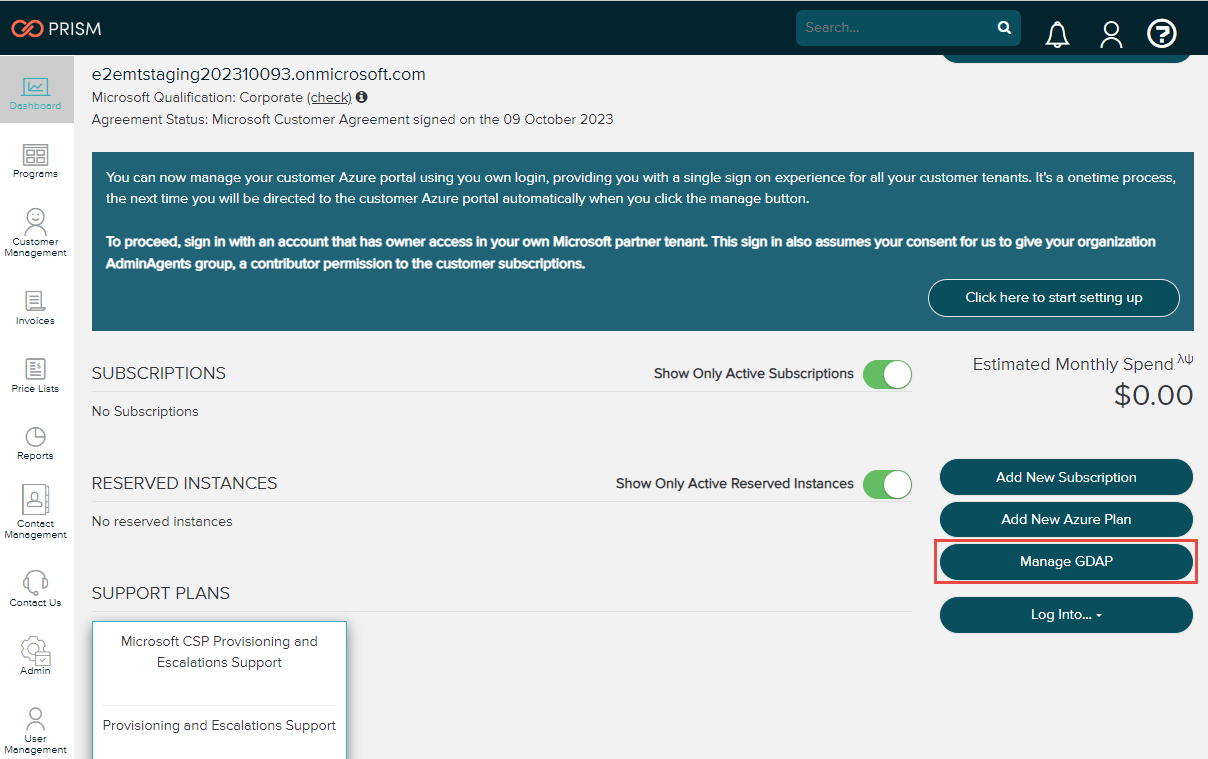Within the tenant select 'Manage GDAP' to access the GDAP settings within PRISM