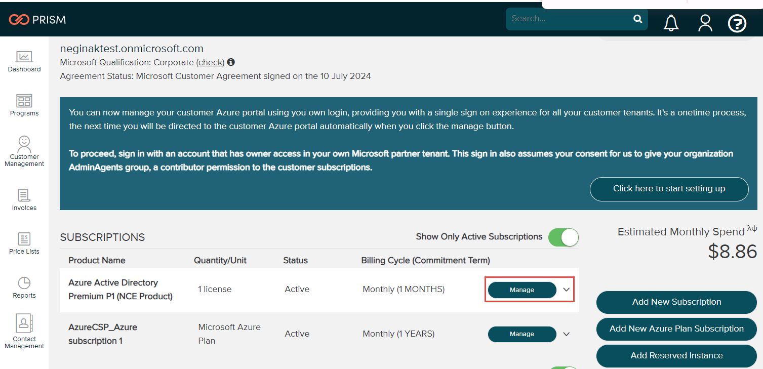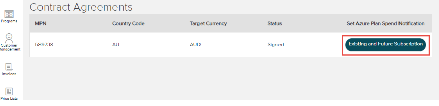 On the following screen you will be shown a list of "Contract Agreements" that you have in PRISM. Please note that a contract agreement is a record of your MPN ID against your Microsoft CSP agreement. Against the contract agreement that you wish to set the Spend Notifications to, select the button "Existing and Future Subscription".