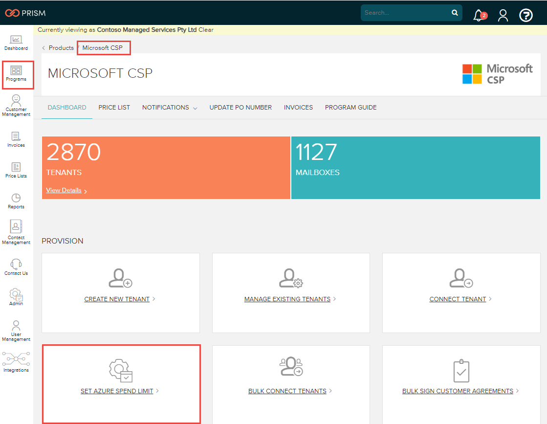 To set a bulk spend notification, go to main Microsoft CSP tile in PRISM and select tile "Set Azure Spend Limit"