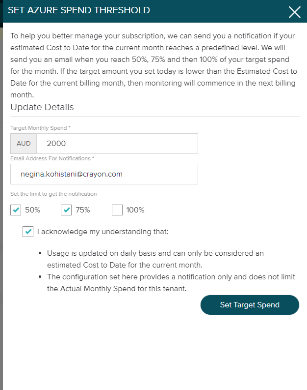 - Set Limit/s to get these notification - select one, two or three of the percentage values, to enable notifications when the Azure Subscriptions meets this percentage value of your Targeted Monthly Spend.