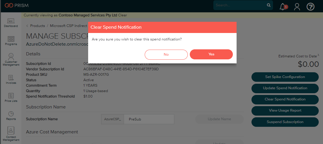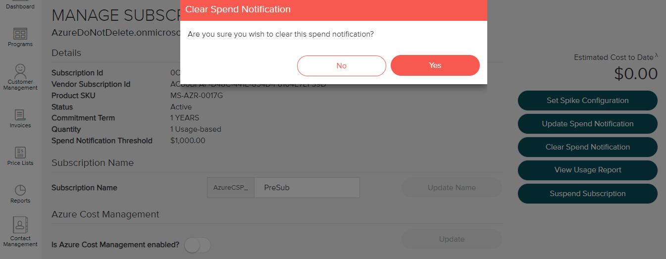 Click on the clear spend notification button, and one should see a confirmation popup. Click 'Yes' to continue.